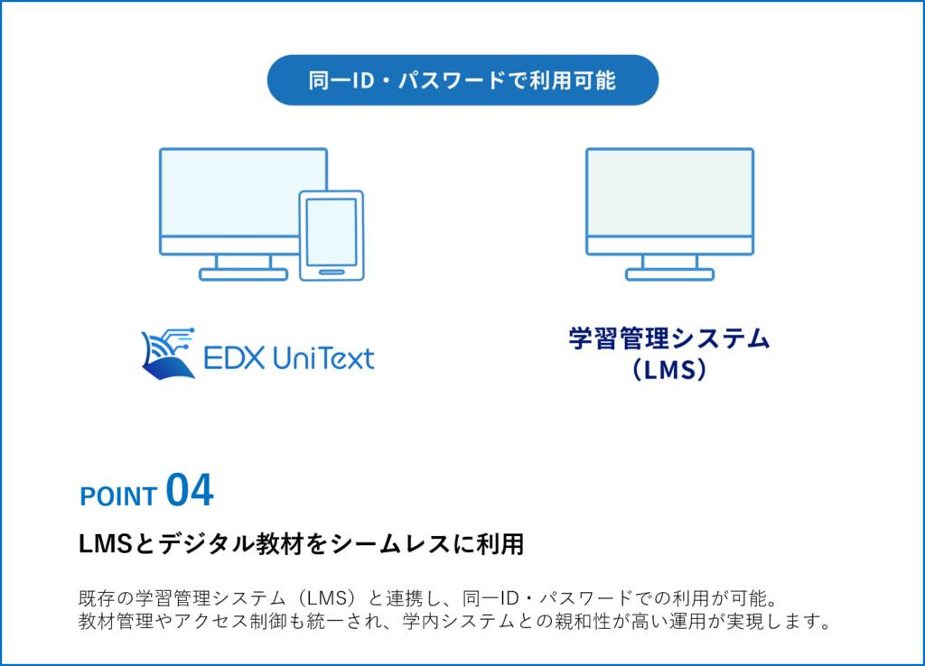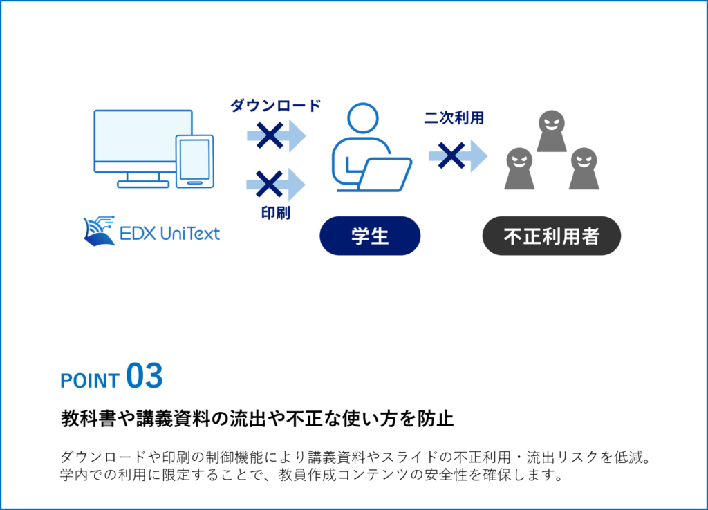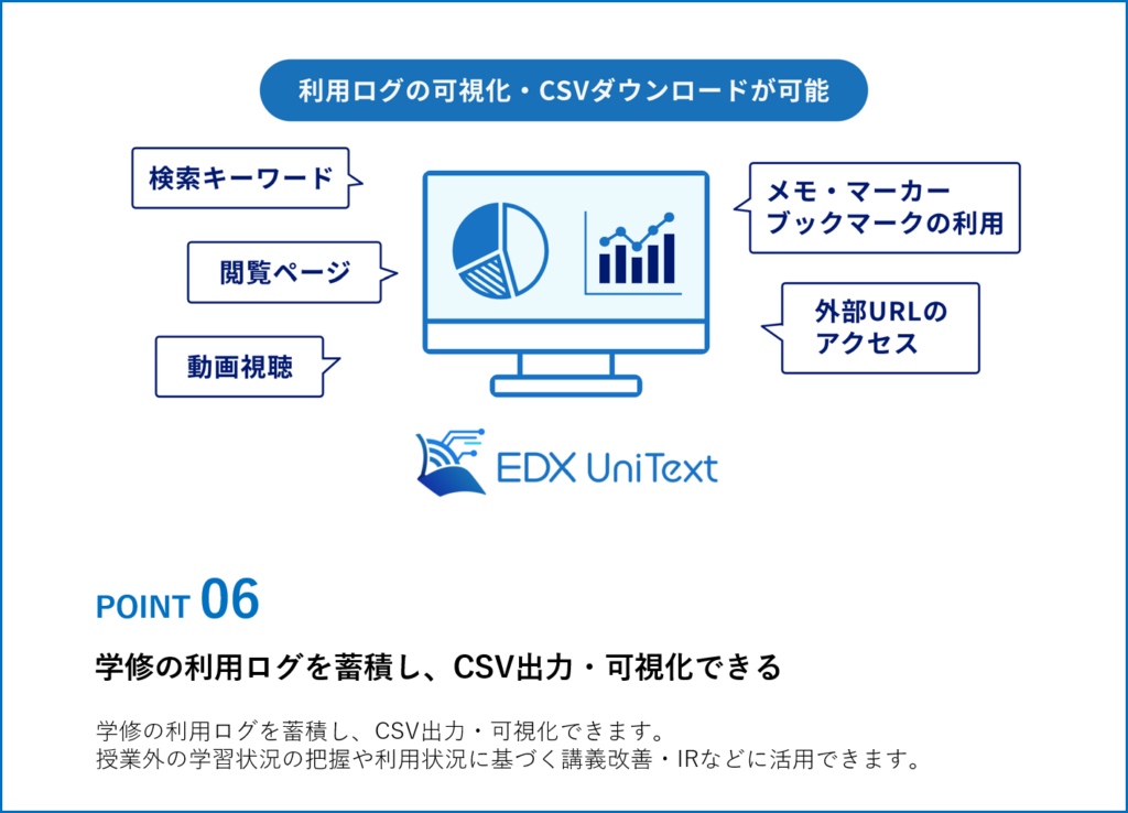 EDX UniTextとは、教科書や教材を閲覧する高機能ビューアーとしての機能だけでなく、コンテンツ配信・管理機能や学修ログデータの取得・活用など